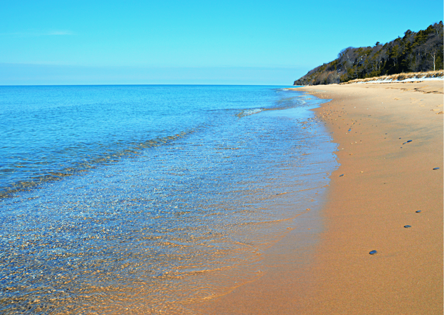This beachy scene along Lake Michigan’s coastline blends light pink, crystal blue, and auburn shades, resembling a watercolor painting—Michigan’s opportunities for swimming in crystal-clear waters, sunbathing on the sandy shores. Golden hour is the best time to take instagrammy photos here—try to plan your visit during sunrise or sunset when the light is soft and warm.