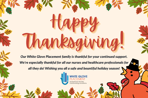 We are so thankful to all our nurses and healthcare professionals who help to keep our community healthy and safe. We appreciate everything you do, and we hope this Thanksgiving and holiday season fills your homes with warmth and love. Wishing you and yours a very Happy Thanksgiving from our White Glove family to yours!